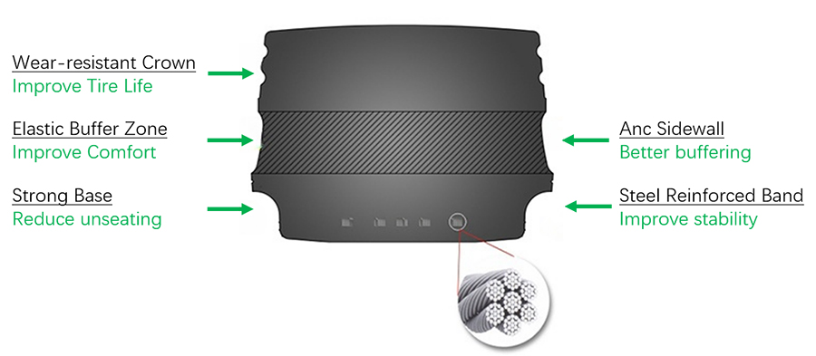 Premium 3 stage solid resilient tire optimized for durability and performance.
